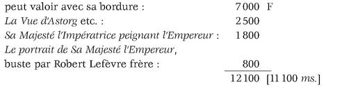 Comme trois de ces ouvrages sont désignés pour être achetés par Sa Majesté, je vous prie, Monsieur le Duc, de me dire le plus promptement possible si vous voulez faire cette acquisition, afin que je change mon travail et \[suggère à\] l'Empereur de porter sa munificence sur d'autres artistes en informant que c'est Votre Excellence qui désire posséder ces tableaux.