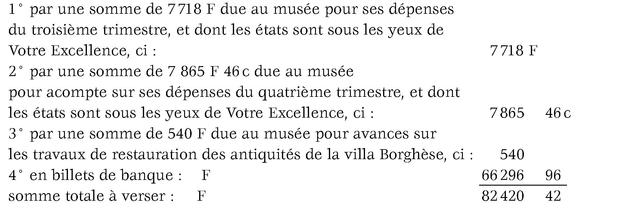 Conformément à votre lettre du 22 janvier qui m'annonce que Votre Excellence a chargé M. de Bayle de venir arrêter les comptes des recettes et dépenses intérieures du musée pendant 1809 et 1810, et m'invite à verser préalablement à la caisse du Trésor la somme de 82 420 F 42c, que le musée se er trouvait avoir en caisse le 1 janvier 1811, j'ai l'honneur de la prévenir que je suis prêt à la compter, savoir :
