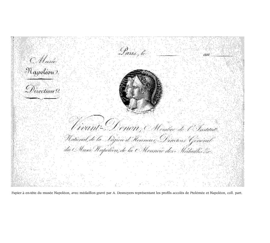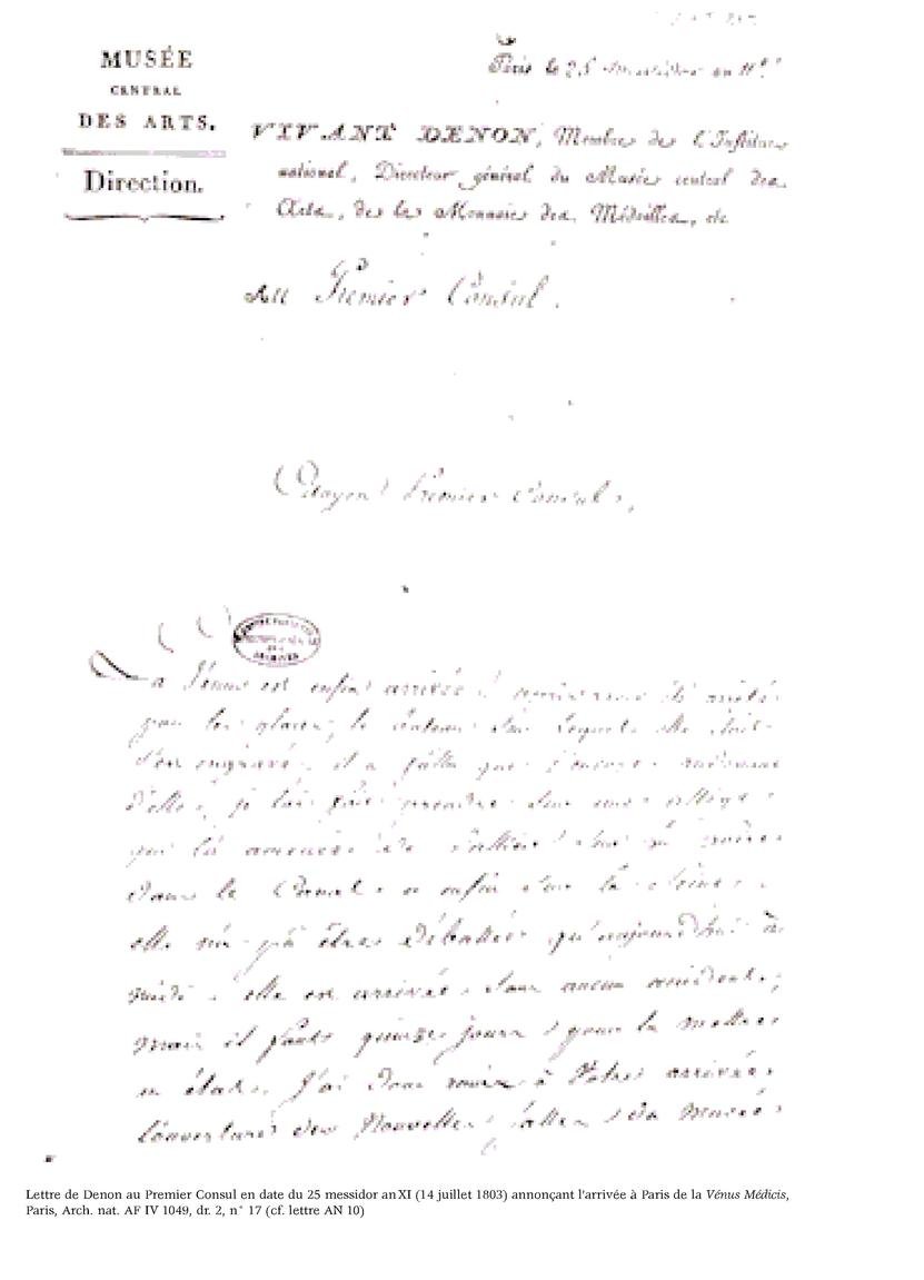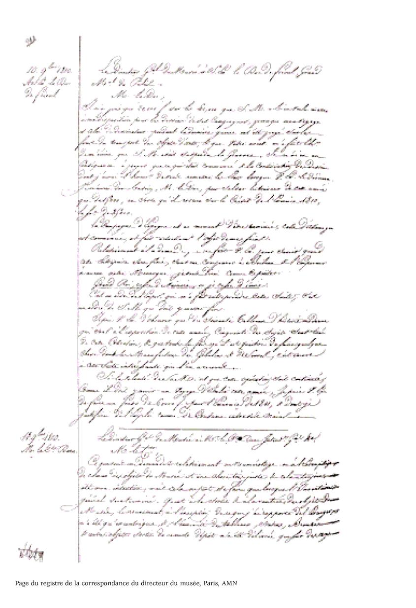 [^2]: Marie-Anne Dupuy, Isabelle le Masne de Chermont, Elaine Williamson, <i>Vivant Denon : Directeur des musées sous le Consulat et l'Empire correspondance (1802-1815)</i>, Editions de la Réunion des musées nationaux, Paris, 1999, Archives des musées nationaux, registre *AA10 [p. 16], Denon |