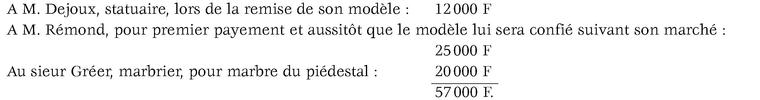 De cette somme de cinquante-sept mille francs, il n'y a à payer pour le moment que celle de 20000 au sieur Gréer, dont les avances pour acquisitions dépassent ce total et qui ne peut mettre les ouvriers en activité que lorsqu'il l'aura reçue. Je vous adresse donc, Monseigneur, un état de proposition pour cet entrepreneur et vous prie de faire ordonnancer cette somme à son profit et pour acompte, j'aurai l'honneur de vous informer des époques de payements à faire aux sieurs Dejoux et Rémond.[^1]