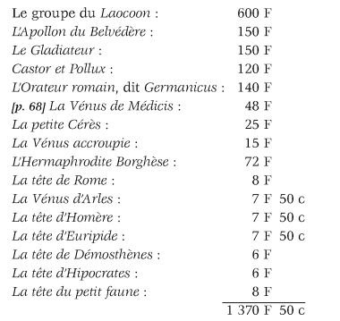 Je ferai, Citoyen Ministre, suivre avec les frais de transport, ceux des caisses et emballage. Je vous prie de me faire acquitter ceux des plâtres, afin que je rembourse au mouleur Getti ses avances. Je vous en transmets ci-joint la liste, qui donne au total de la somme de treize cents soixante-dix francs cinquante centimes.
